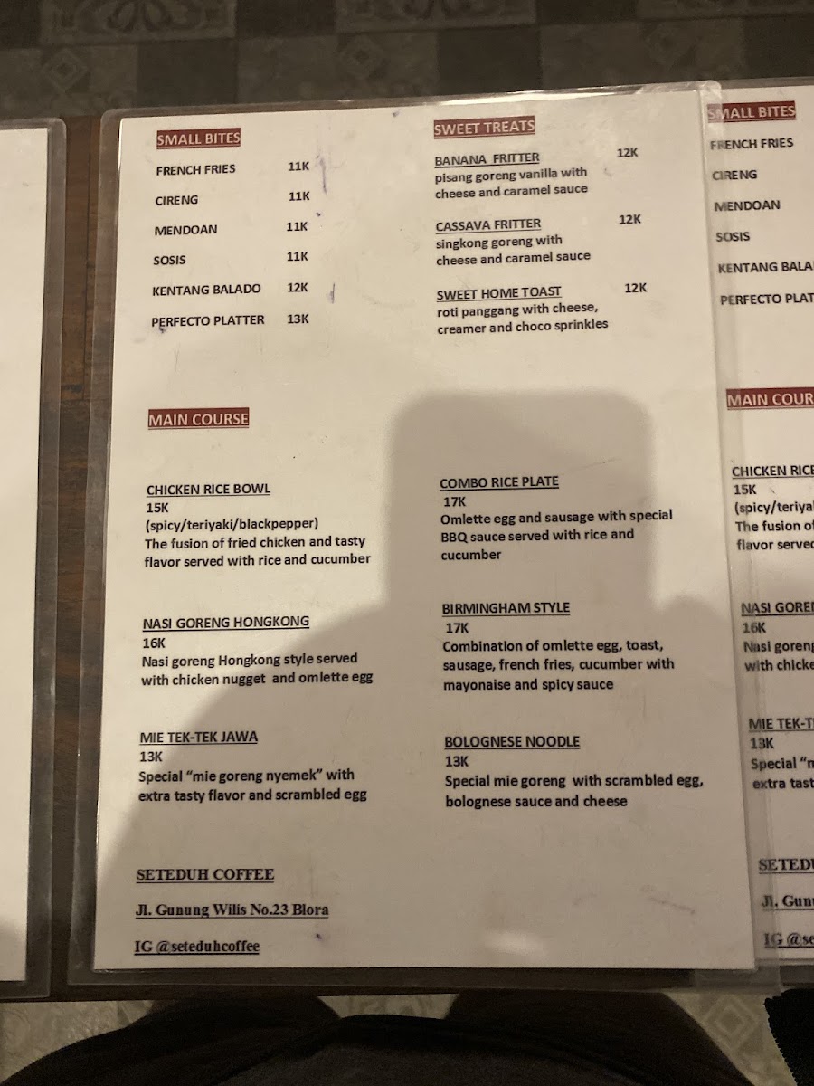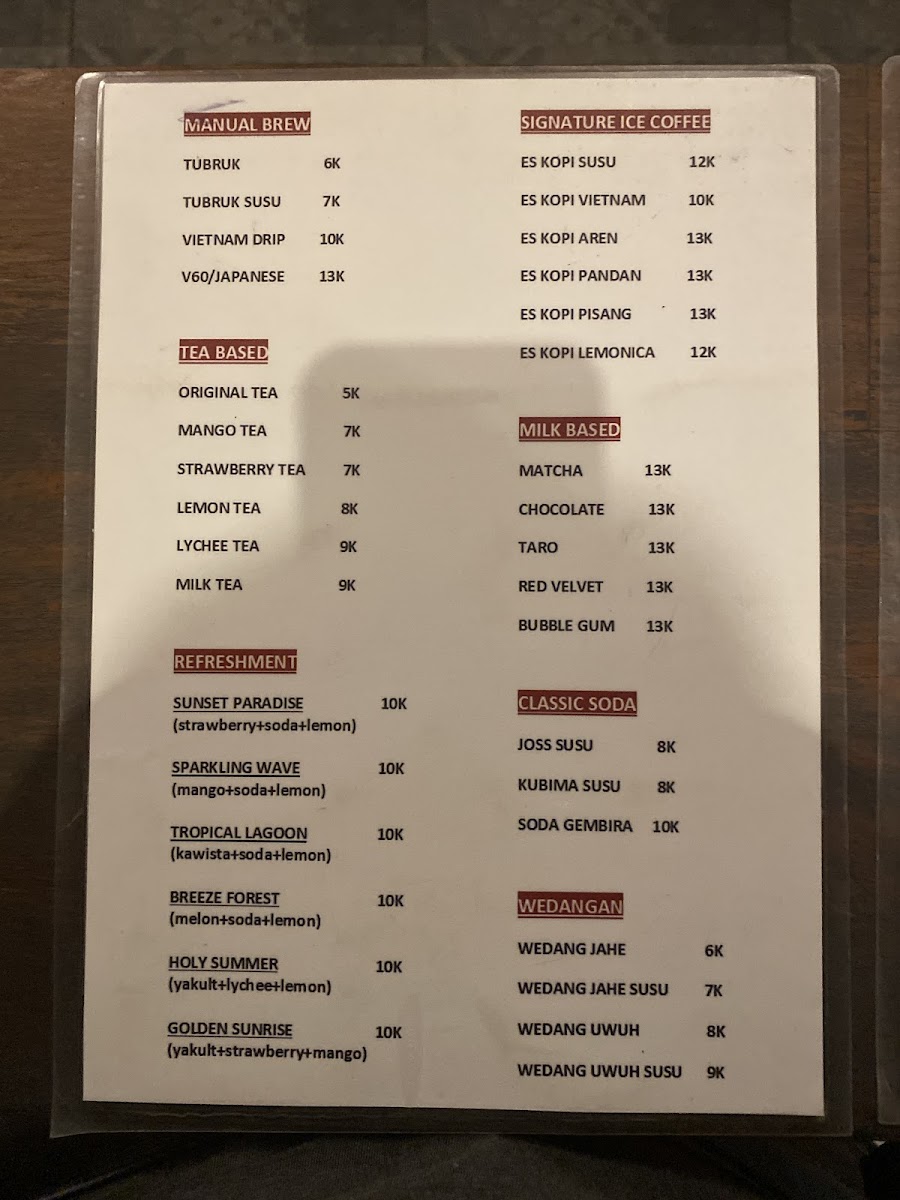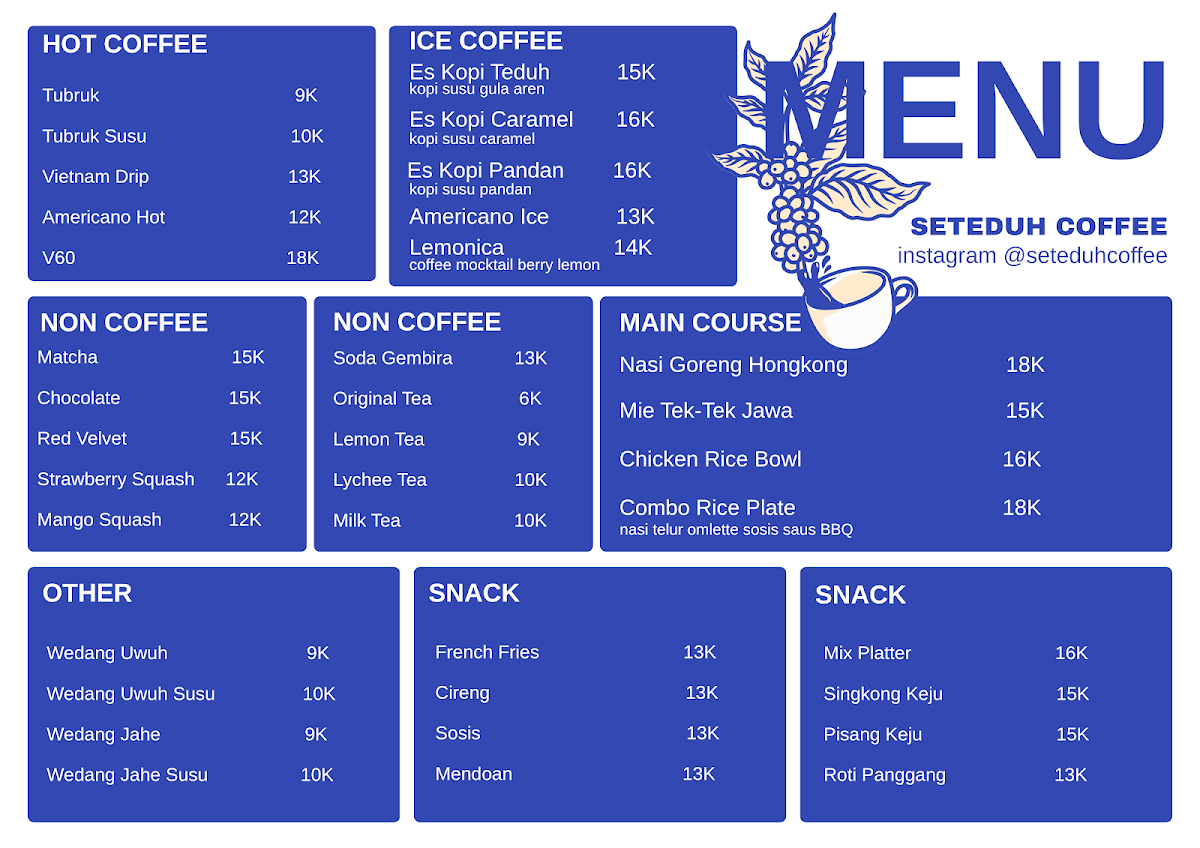 Seteduh Coffee offers a delightful and varied menu that caters to both coffee enthusiasts and those seeking satisfying meals. One of the highlights is the Kopi Susu, a sweet and smooth coffee drink perfect for those who enjoy a balanced mix of espresso and creamy milk. Another innovative drink is the Coffee Beer, which blends the rich flavors of coffee with the refreshing taste of beer, making it an excellent choice for adventurous drinkers. For a more substantial option, the Nasi Goreng Bakso stands out as a hearty and flavorful dish, combining fried rice with savory meatballs that are sure to satisfy. The coffee selection is impressive, especially the Kopi Bali Kintamani Arabica, a premium choice that offers a bold and aromatic experience, reflecting the high-quality beans from Bali. Overall, Seteduh Coffee's menu brings together well-crafted beverages and delicious meals, making it a fantastic spot for any coffee lover or casual diner.